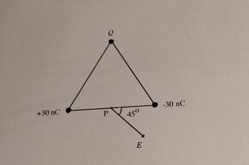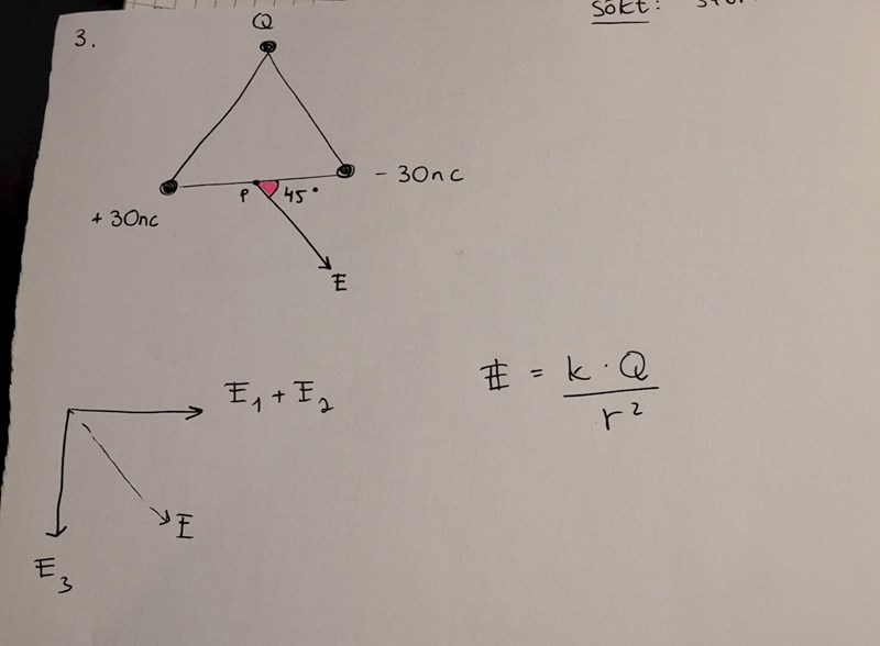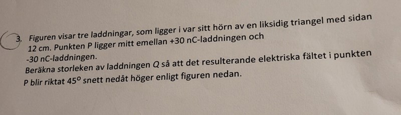 Börja med att räkna ut fältstyrkan från de båda kända laddningarna i punkten P. Vilken storlek och riktning behöver fältstyrkan från Q ha för att den resulterande fältstyrkan skall bli den önskade?