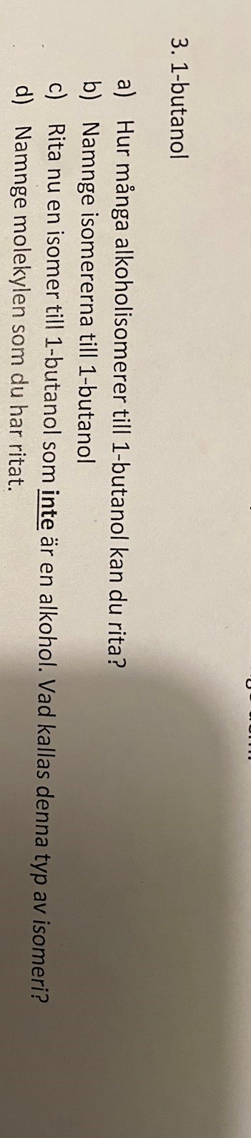 Du har inte löst a) och b) än. Strukturisomerer har samma summaformel, men både kolatomerna och syreatomerna kan bilda olika kedjor med förgreningar. I c) kan du inte ersätta OH-gruppen med en annan funktionell grupp - du ska ha syreatomen med, men den ska inte ingå i en OH-grupp.