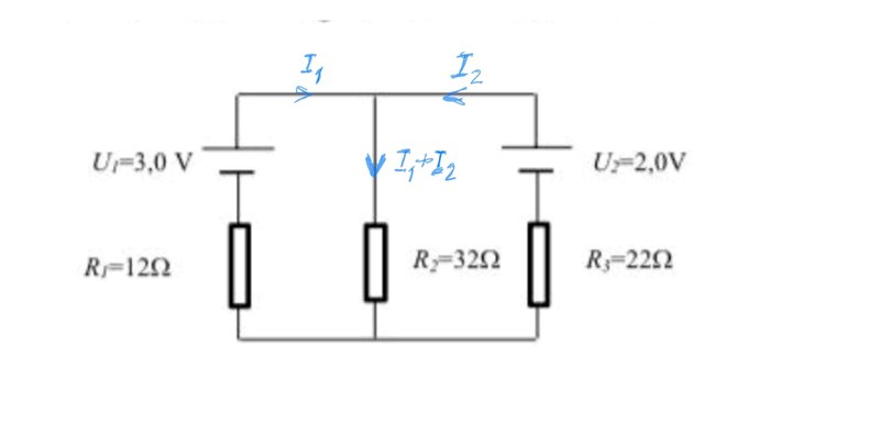 Nej, I2 blir faktiskt negativ. Så det högra batteriet laddas med en liten ström (6 mA) av det vänstra. Spänningen över det mellersta 32 Ω motståndet blir alltså blir aningen över 2 V som är spänningen för det högra batteriet.