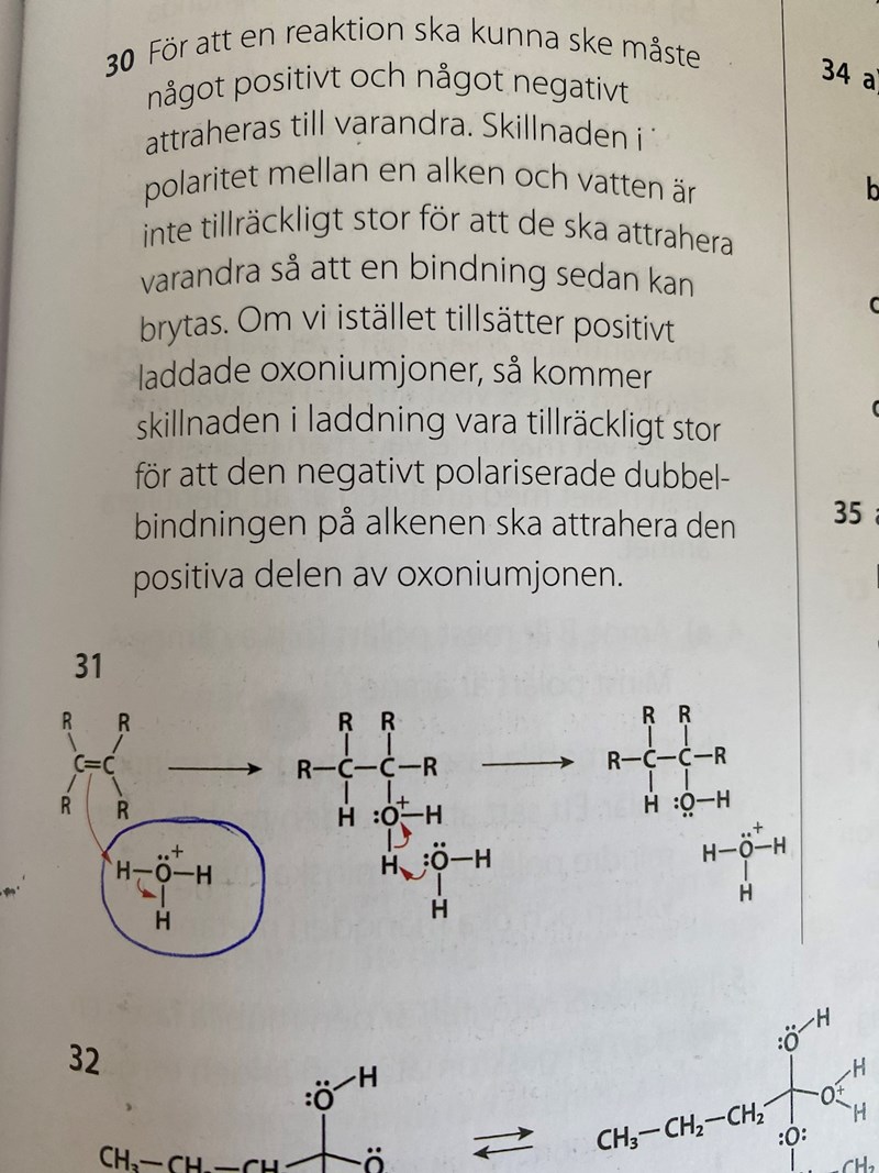 Nope, men det är en syra. Alkenen plockar upp ett väte och blir positivt laddat. Vatten kan då funka som en bättre nukleofil. Det är därför man pratar om "syrakatalys". Tycker svaret på 30 är rätt bra, vad exakt är det du inte är med på?