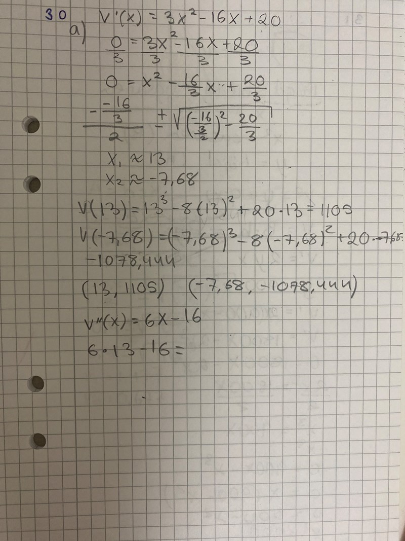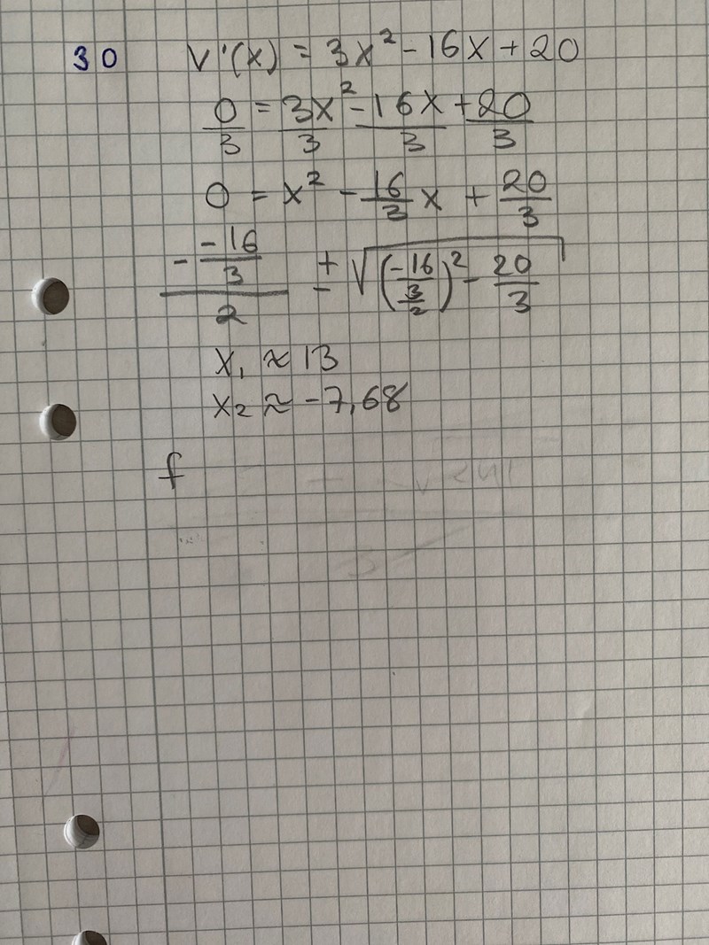 Derivatan blir V'(x) = 3x2-16x+20, som har nollställena x = 2 och x = 10/3. Du har alltså räknat fel på din pq-formel. Det förklarar varför resten du har räknat blir fel.