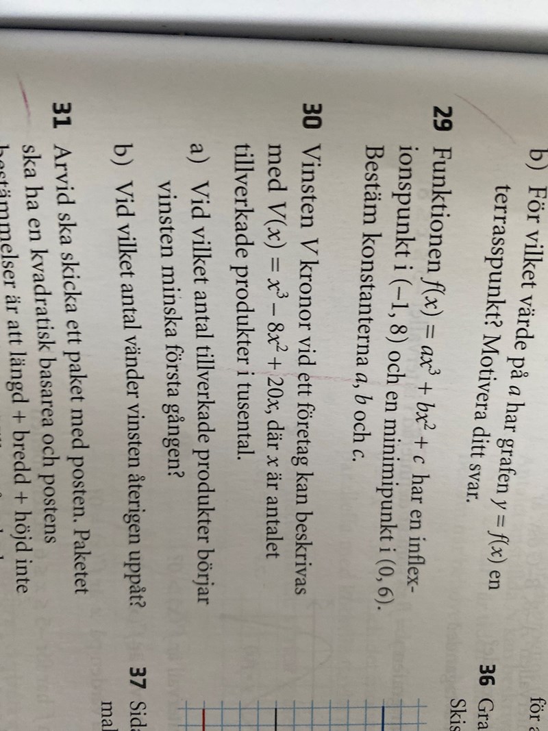 Funktionen för V(x) är en tredjegradsfunktion med positiv koefficient för x3-termen, så mycket förenklat ser funktionens graf ut så här: /. Derivatan är en andragradsfunktion med positiv koefficient för kvadrattermen, så den ser i stort sett ut så här: U.