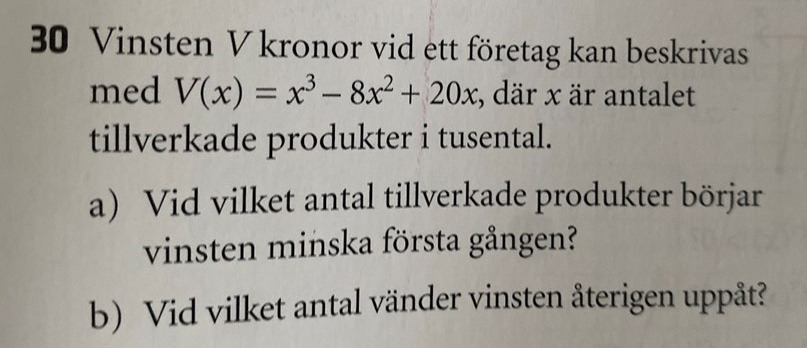 När vinsten börjar minska för första gången är precis när derivatan är 0 för första gången. När vinsten vänder uppåt igen är det vid derivatans andra nollställe.