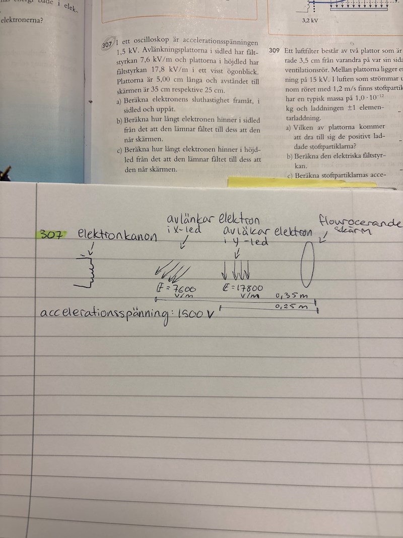 Hej! Jag fattar inte fråga a. Vad menas med sluthastigheten? Är inte hastigheten densamma genom hela oscilloskåpet?