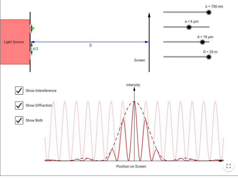 För dubbelspalt så får du den tjocka röda linjen. (Både diffraktion p.g.a spaltbredden och interferens mellan ljus från olika öppningar.)