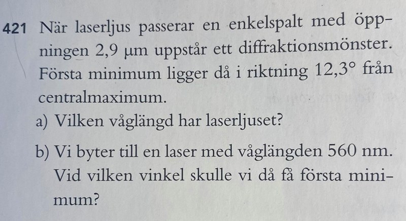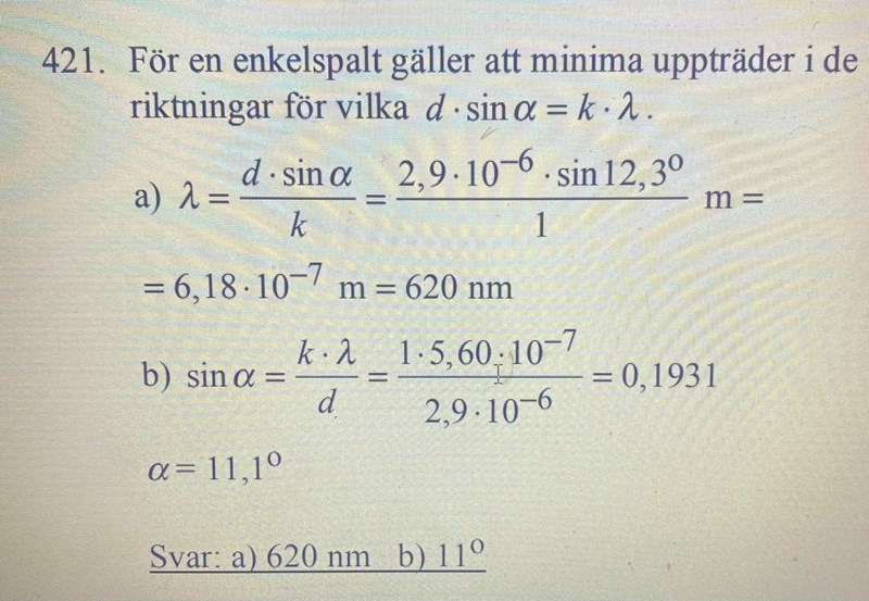 I en enkelspalt av bredd d så anges vinkeln θ till minimum nr n (p.g a diffraktion) av