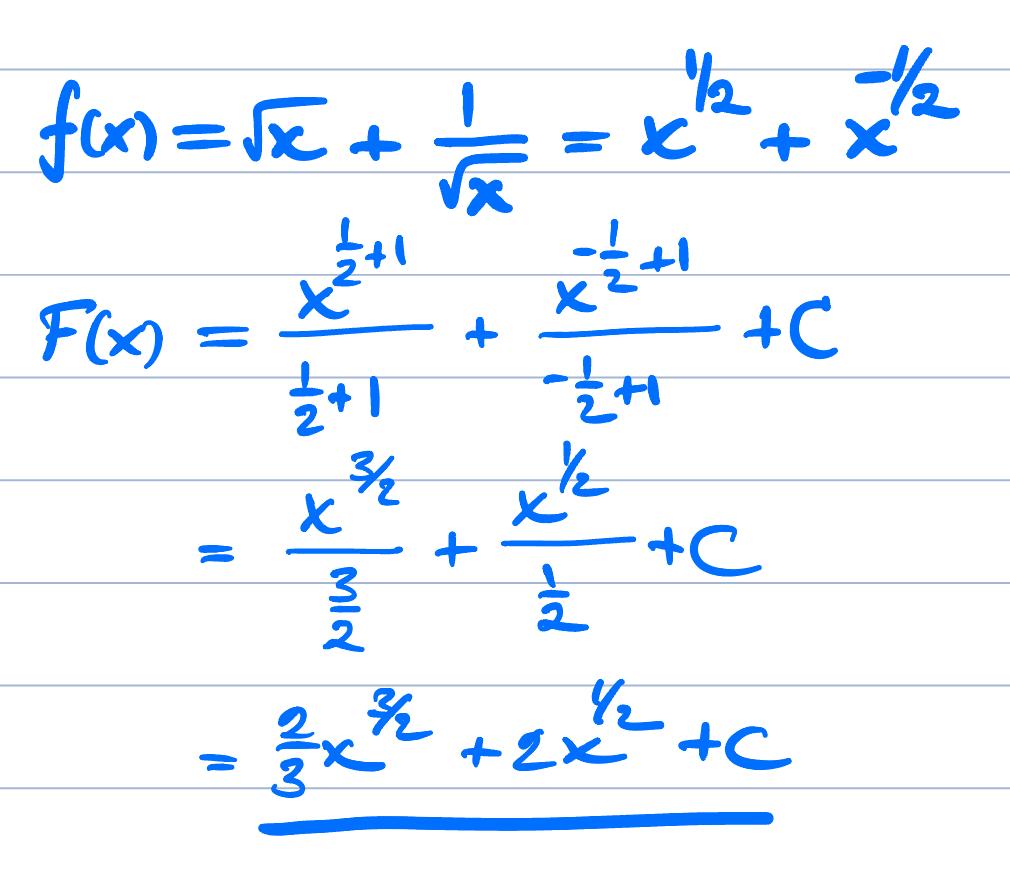 Frågan är "Ange alla primitiva funktioner till e) f(x)= " Jag fick svaret F(x)= för just roten ur x och förstår ej hur svaret där blev ?