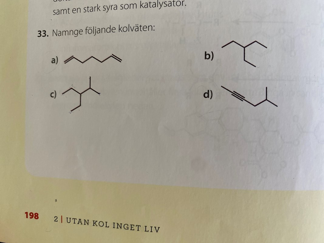Så 6-kolkedjan blir då "2-hexyn". "-yn" är kemisnack för tryppelbindning o tvåan fär får att visa vilket kol med lägst nummer som trippelbindningen sitter.
