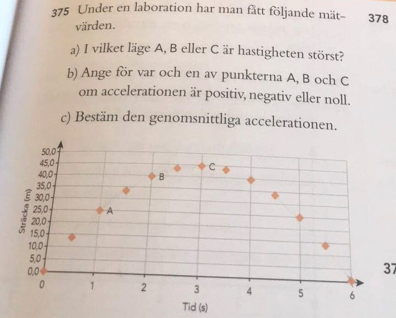 Jag inte förstår hur det i punkten C ska va acceleration negativt. Varför är inte det noll? Lutningen i punkt c är ju 0 och då borde hastigheten vara 0 och accelerationen bli också 0 då. Men facit säger att det är negativt