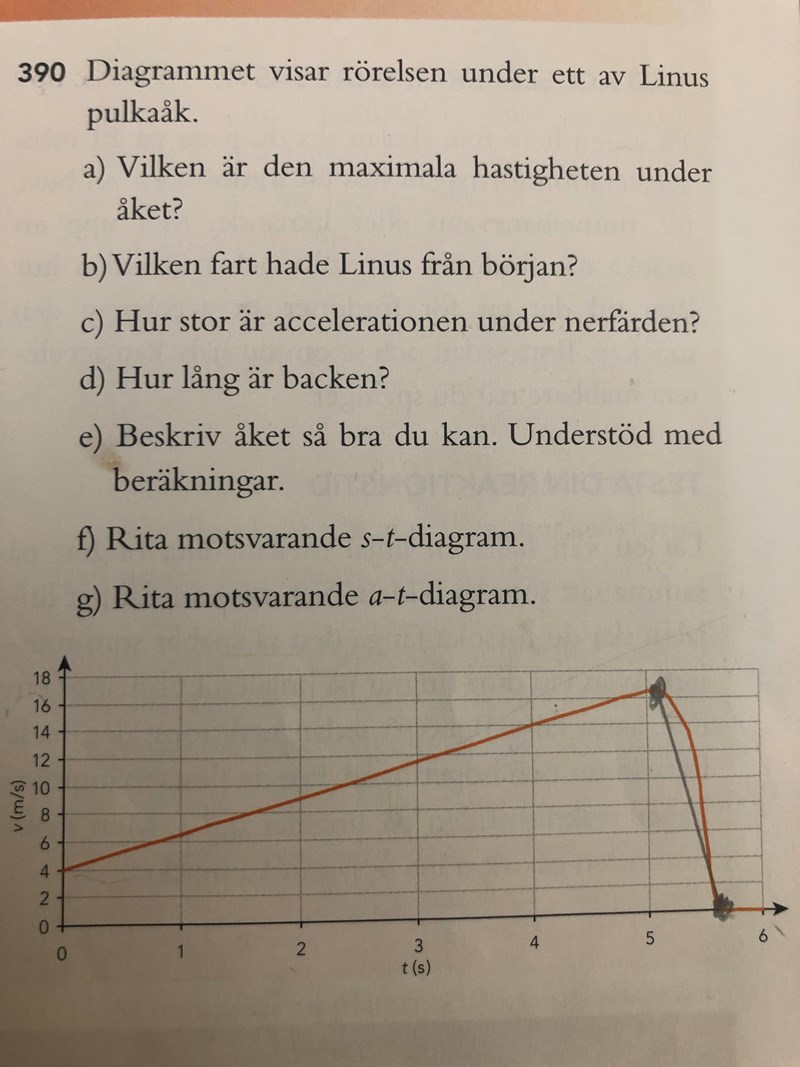 Aha. Det betyda att för varje sekund ökar pulkans hastighet tills den bromsas efter t=5,6s