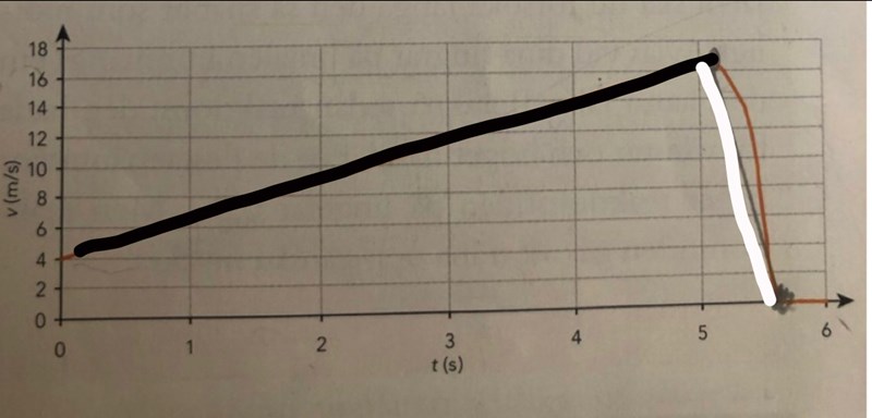Lutningen på grafen ger accelerationen. Jag prickade 2 punkter på nerförsbacken och räkna k värdet o fick det till -55m/s^2 vkt är fel. Punkterna jag valde är (5.2;16.5) och (5.5;0) . Hur man annars kan räkna ut lutningen på den linjen som ”åker neråt”?