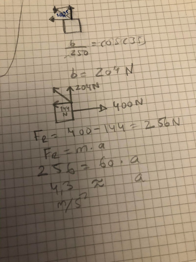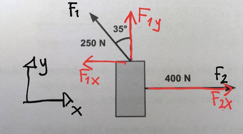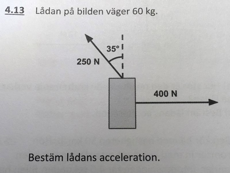 Har du glömt den där kraften om 400N åt höger? Om du ritar upp alla krafter som finns så är det två krafter i x-led (höger-vänster) och två krafter i y-led (upp-ner). Du kan summera dessa krafter var för sig, och sen dividera med massan, så har du x och y-komposanterna för accelerationen.