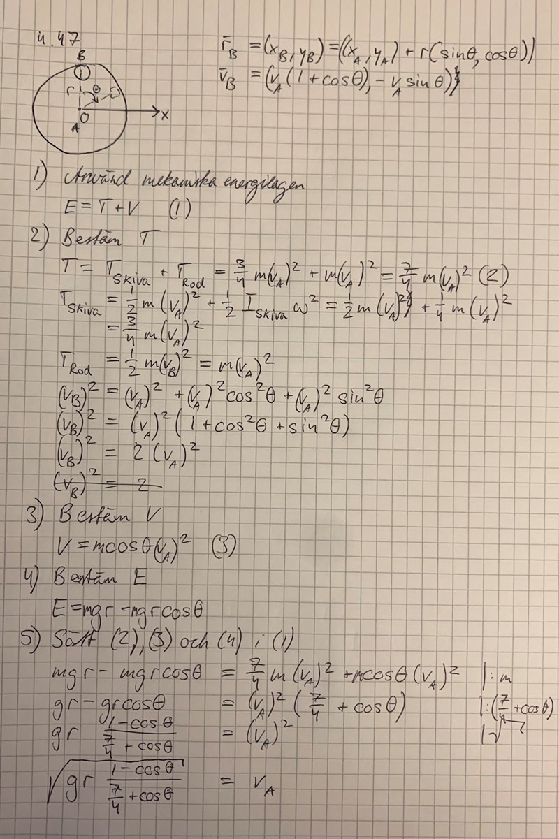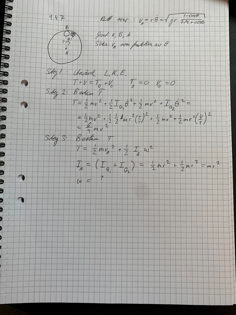 Tskiva=12m(vA)2+12Iskivaω2=12m(rω)2+14m(rω)2=34m(rω)2T_{skiva} = \dfrac{1}{2}m(v_A)^2+ \dfrac{1}{2}I_{skiva}\omega^2 = \dfrac{1}{2}m(r \omega)^2+ \dfrac{1}{4}m(r\omega)^2 = \dfrac{3}{4}m(r\omega)^2