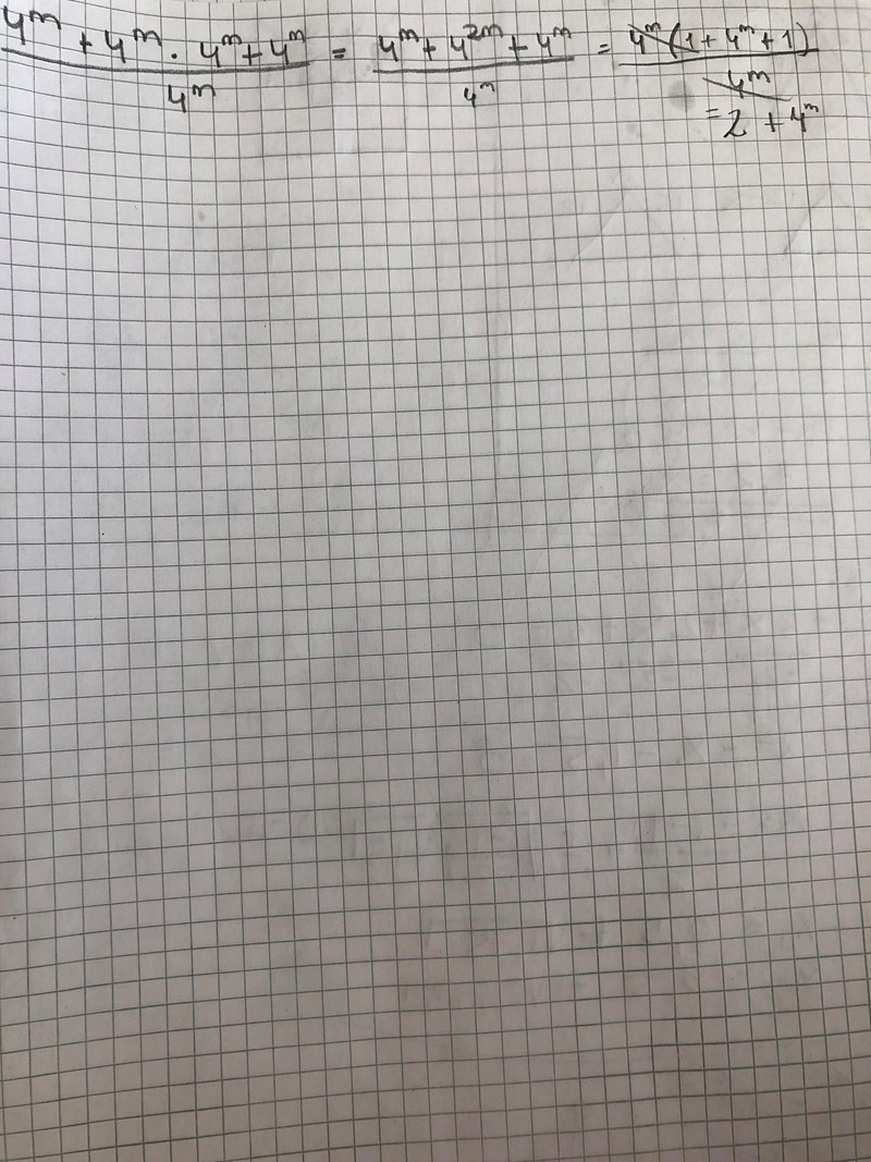 Börja med att räkna ut vad 4^m*4^m som är i mitten genom att använda potenslagarna. Sen kan du bryta ut det som är gemensamt i täljaren.