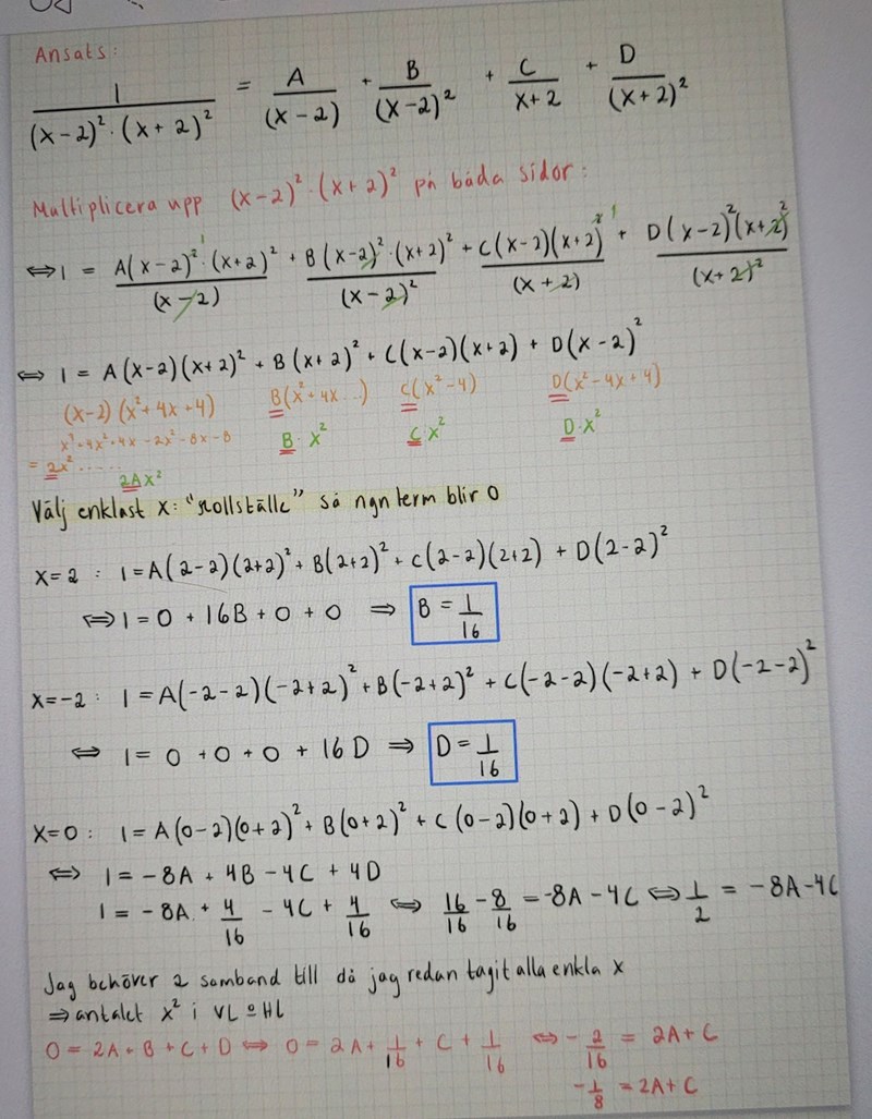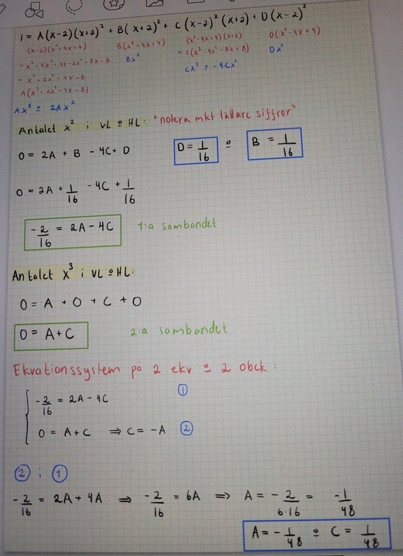 Jag fattar inte varför ekvationerna blir fel. Det ska bli A=-1/32 och C=1/32. Jag har kollat en extra gång också