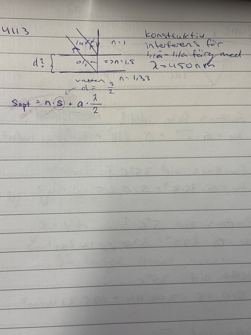 Han använde en formeln jag inte känner igen. Hur ska jag tänka med den formeln jag skrev upp.. mitt problem är att eftersom det är en och samma våglängd hur ska jag räkna ut en vägskillnad? Oftast brukar det vara två olika ljusvågor med olika våglängd, nu är det en och samma?