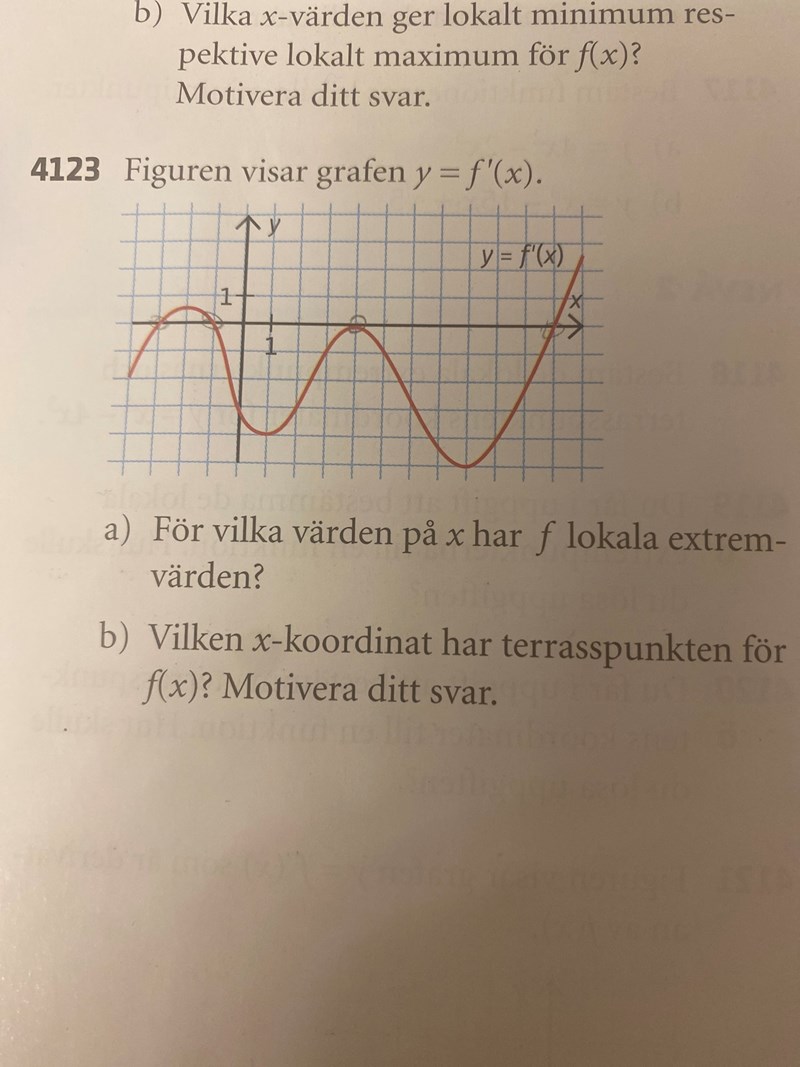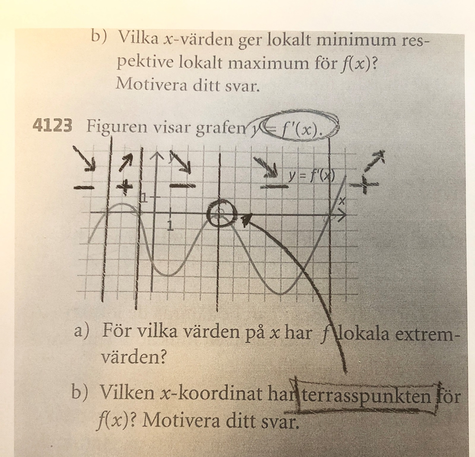 För vilka x-värden derivatan har värdet 0, och om det finns något av dessa värden som är ett maximi-eller minimivärde för derivatan (d v s där andraderivatan skule vara 0).