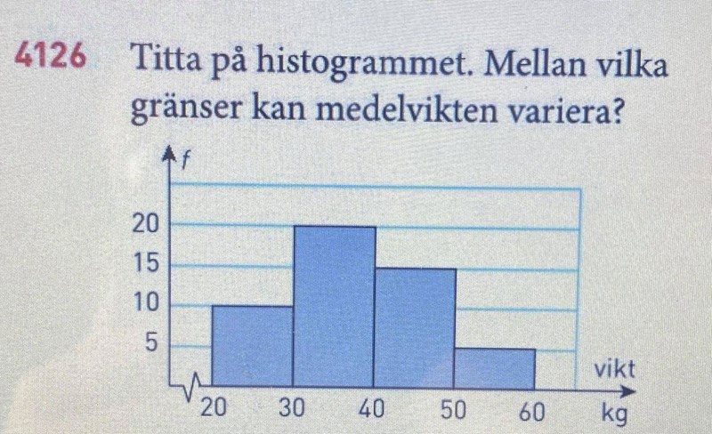 Du har 10 stycken mätningar som ligger mellan 20 och 30, men vet inte exakt var i intervallet som mätningarna ligger. Det kan vara så att de ligger precis ovanför 20 g allihopa, eller att de ligger alldeles under 30 g allihopa. Det innebär att den totala massan för alla ligger mellan 200 och 300 g. Resonera på samma sätt för de tre andra intervallen. Hur mycket kan alla 50 mätningarna vara sammanlagt som mest och som minst?