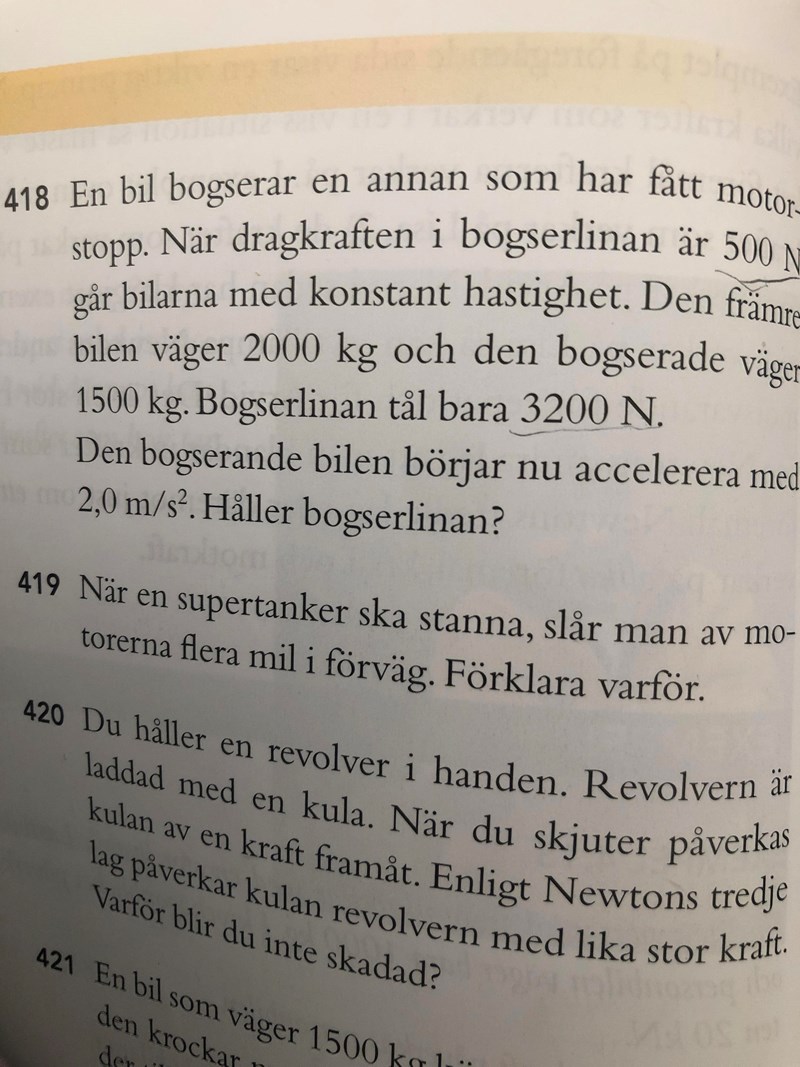 F=3000N . Bogserlinan tål 3500N. Jag kan inte beräkna kraften för den främre bilen för det står ingen acceleration till just den bilen. Utan det står att bogserbilen accelererar inte att den främre bilen accelererar.:. Enligt mina uträkningar borde den tåla. Men i facit står det att den inte tål. Varför?