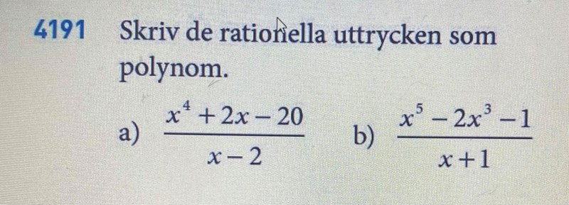 Ansätt sedan polynomet och välj och sådana att . Då är din kvot lika med polynomet .