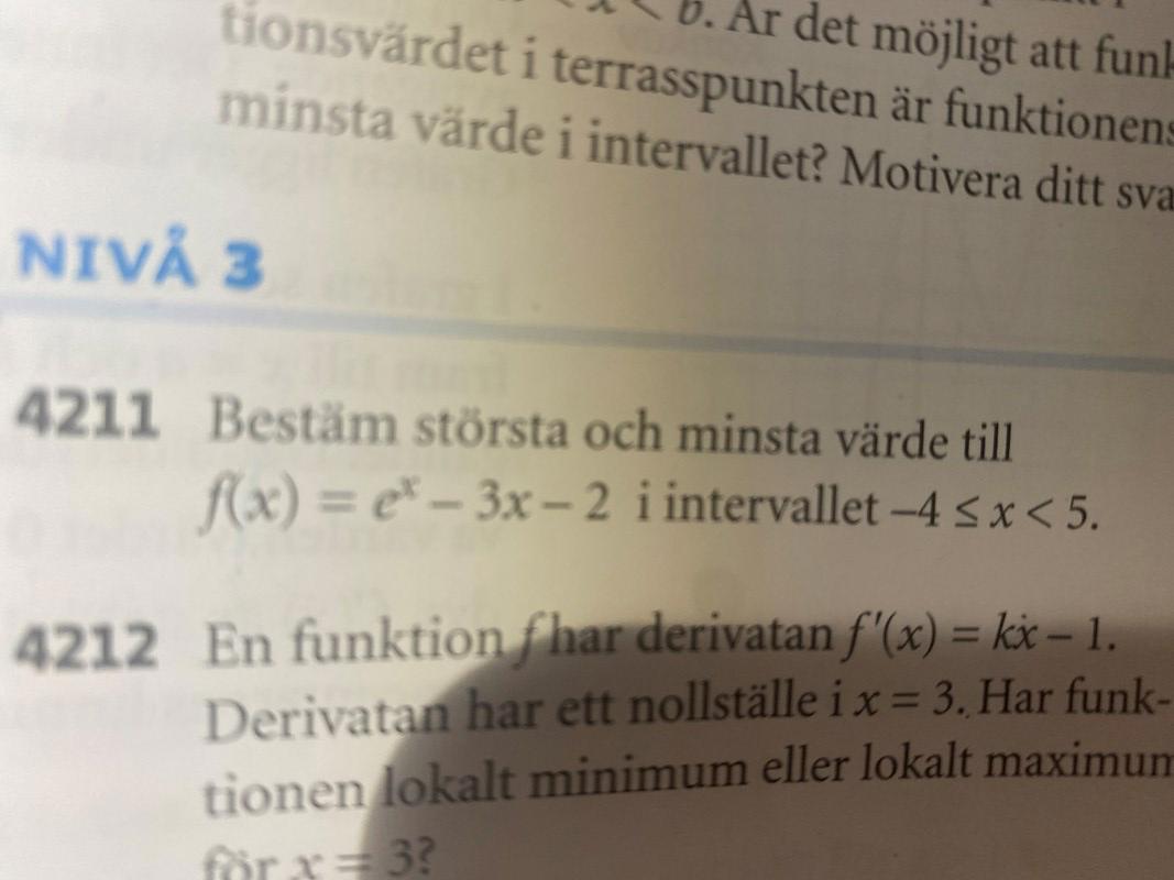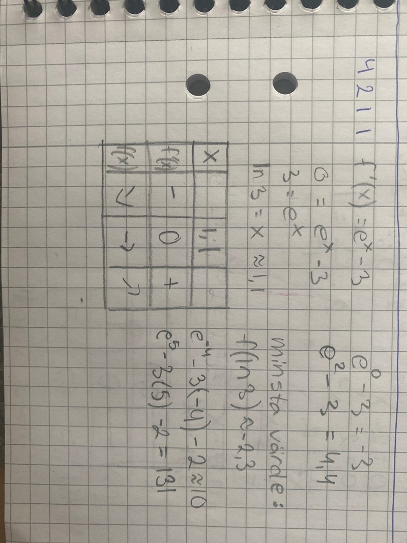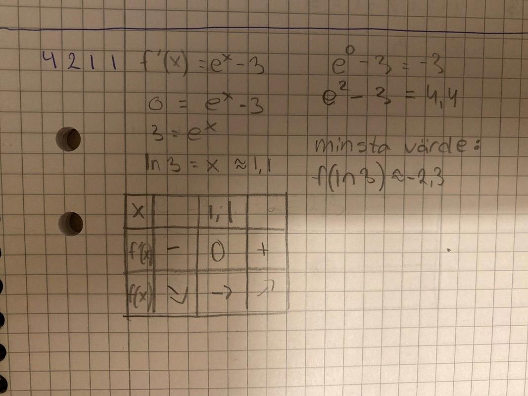 Ja, nu har du ett värde, men du vet inte om det är max eller min. Du kan använda andraderivatan för detta, eller så gör du bara som du gjort nu och stoppar in det i funktionen. Nästa steg är att testa stoppa in x=-4 och x=5 in i funktionen och jämföra dess värde med punkten du fått ut.