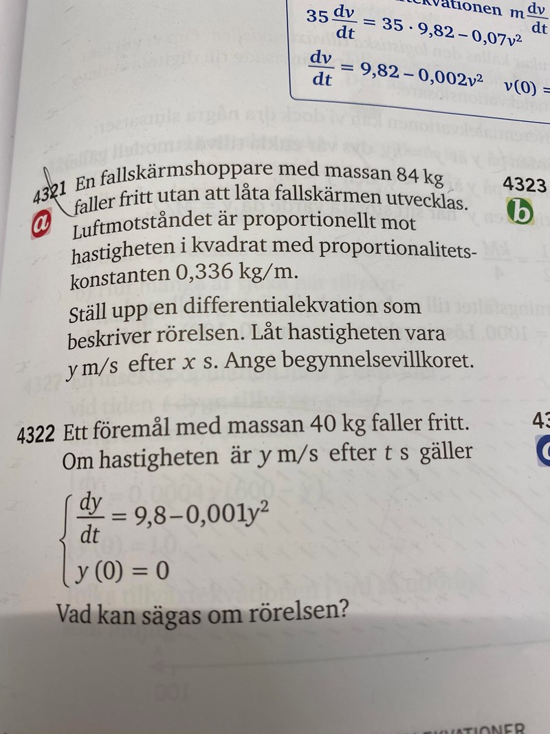 Differentialekvationen beskriver ett fall där man tar hänsyn till luftmotståndet, dvs först kommer föremålet att accelerera, men ju fortare det faller desto högre blir luftmotståndet. Till slut blir det ingen acceleration utan hastigheten är konstant. Du kan använda differentialekvationen för att räkna ut vilken hastighet det blir och hur lång tid det tar.