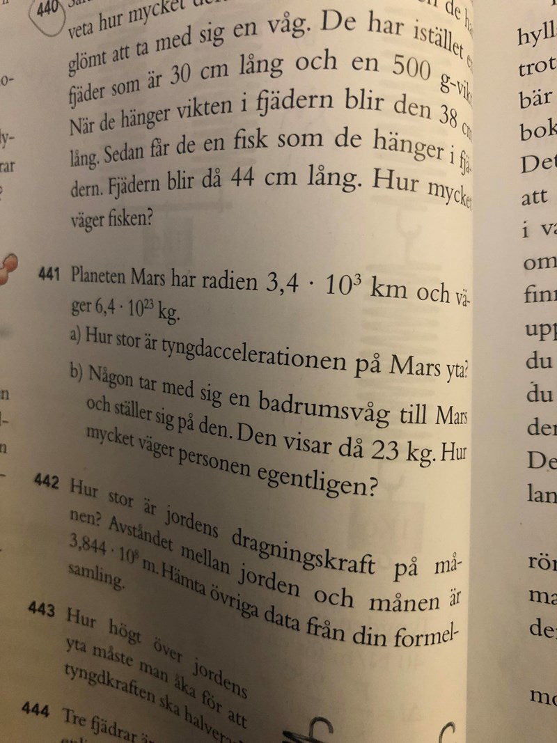 Smaragdalena skrev:Du har räknat med massan 1 kg, så tyngdgravitationen är 3,7 N/kg. Om man kommer ihåg att definitionen är 1 N = kgm/s2 så kan man se att N/kg är precis samma sak som m/s2.