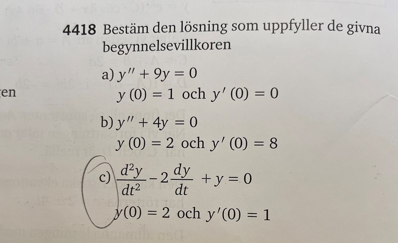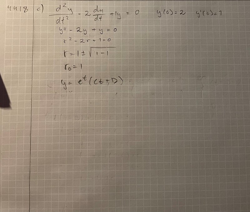 Hej! Jag har fått fram den allmänna lösningen, men förstår inte riktigt hur jag ska hitta konstanterna när rötterna är lika då derivatan av ekvationen blir likadan. Infogar bild på uppgift och min lösning än så länge :)