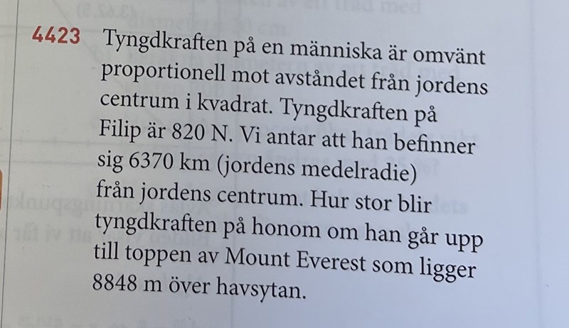 x=(800*6370^2)/8848. Då blir du x ungefär 3.6 miljoner N och det är inte rätt svar.