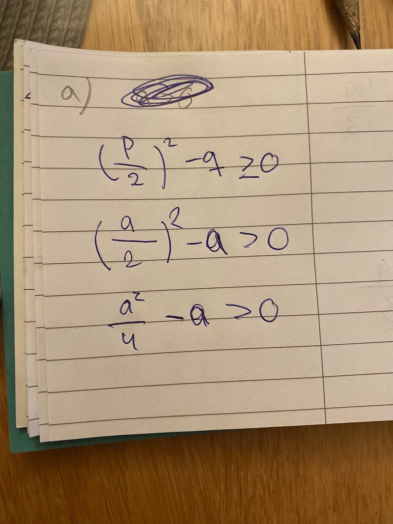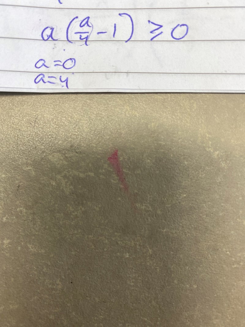 Du kan sätta a2/4-a=0 och lösa denna. Det kommer finnas två lösningar till denna ekvation. Med tanke på hur funktionen till VL ser ut kommer de lösningar vi vill åt vara de a som är mindre än den minsta lösningen och större än den stora lösningen.