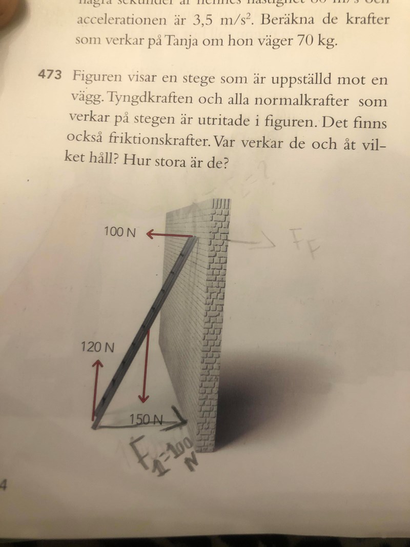 Jag lyckades själv komma fram till att den första frimtionskraften som jag kallar för F1 ska vara 100N (se min pil på bilden). Däremot har jag ingen aning om vart den andra friktionskraften ska vara, samt hur stor den ska vara. Någon tips?