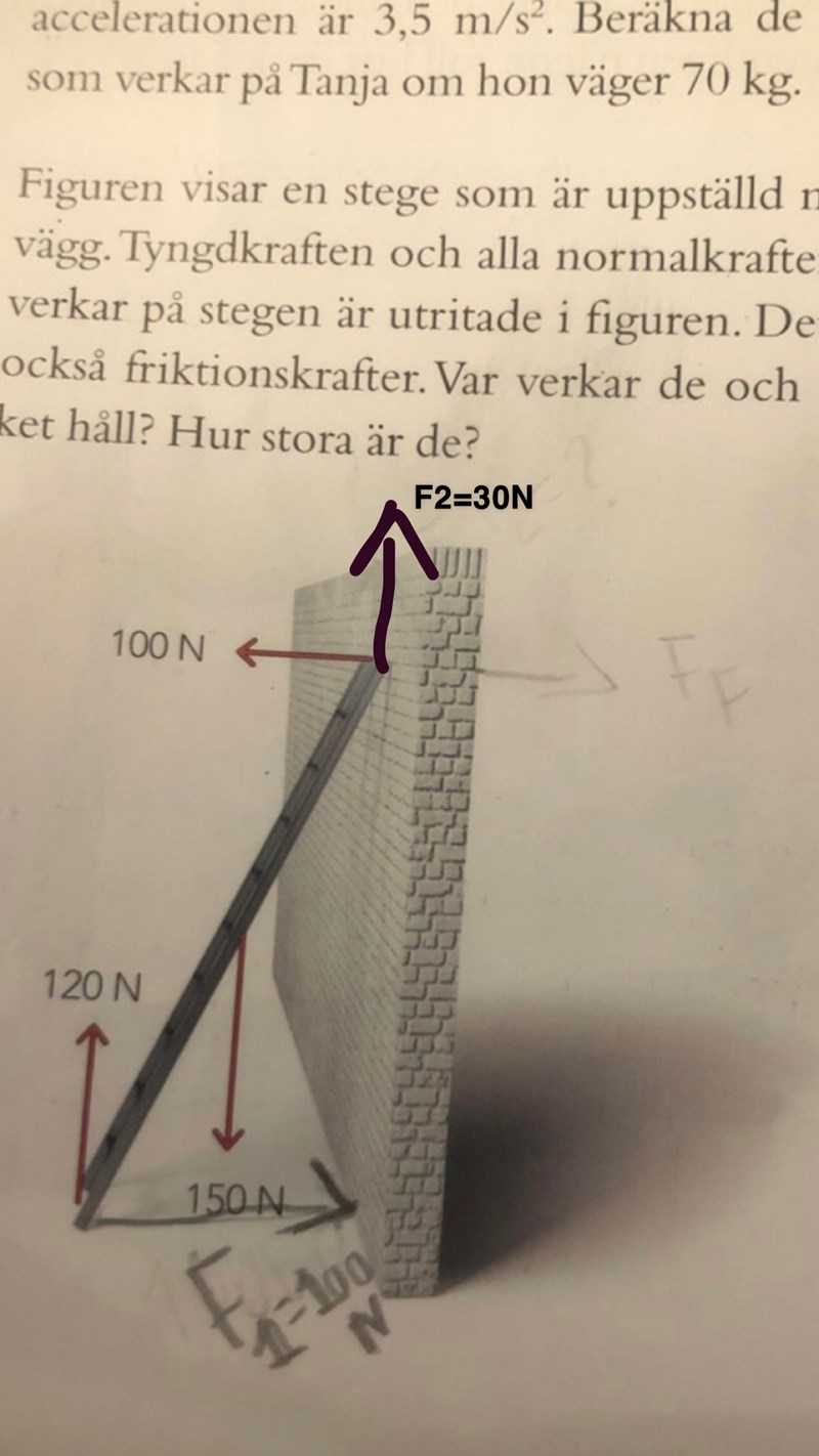 Eftersom det är en kraft på 30 N (=150 N - 120 N) som verkar nedåt från stegens väggpunkt måste det finnas en friktionskraft uppåt på motsvarande värde vid jämnvikt.
