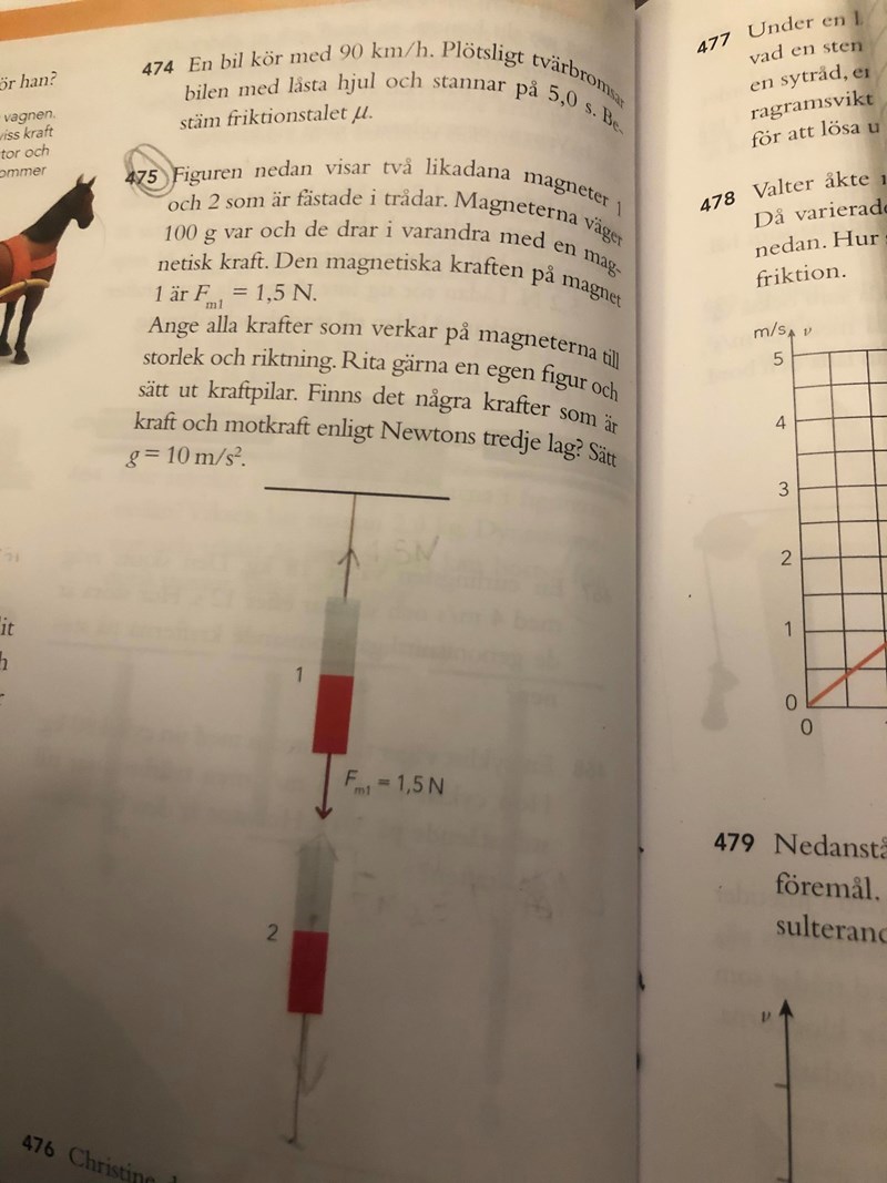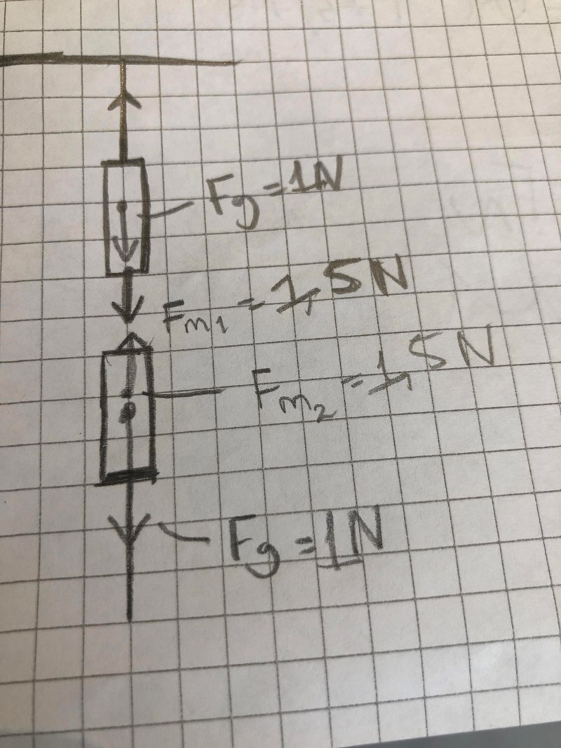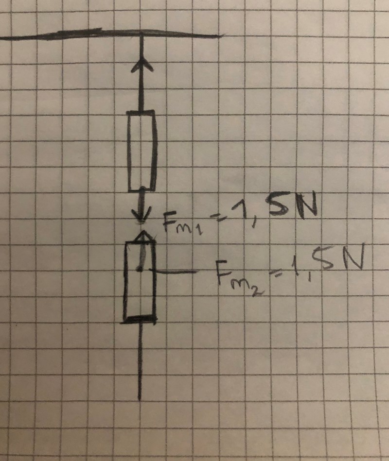 Jag hitta 2 krafter som verkar från magnetens startpunkt upp mot tråden. Som ska vara 1.5N i både den nedre magneten och det övre magneten. Men jag förstår inte hur jag ska göra.