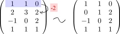 Om vi börjar med din matris kan ett första steg vara att addera (-2 gånger rad 1) till ( rad 2) enligt regel 3. Så här :