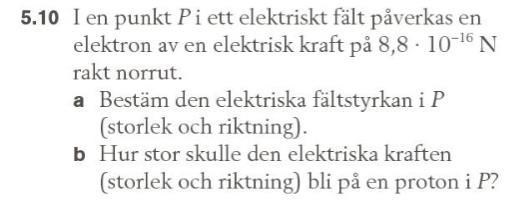 Jag har fått fram svaren men jag förstår inte hur jag ska tänka kring riktningen på elektriskt kraft och fältstyrka. Jag tänkte att om punkt p som är en elektron påverkas av en kraft rakt norrut så måste den elektriska fältstyrkan påpeka som bilden nedan