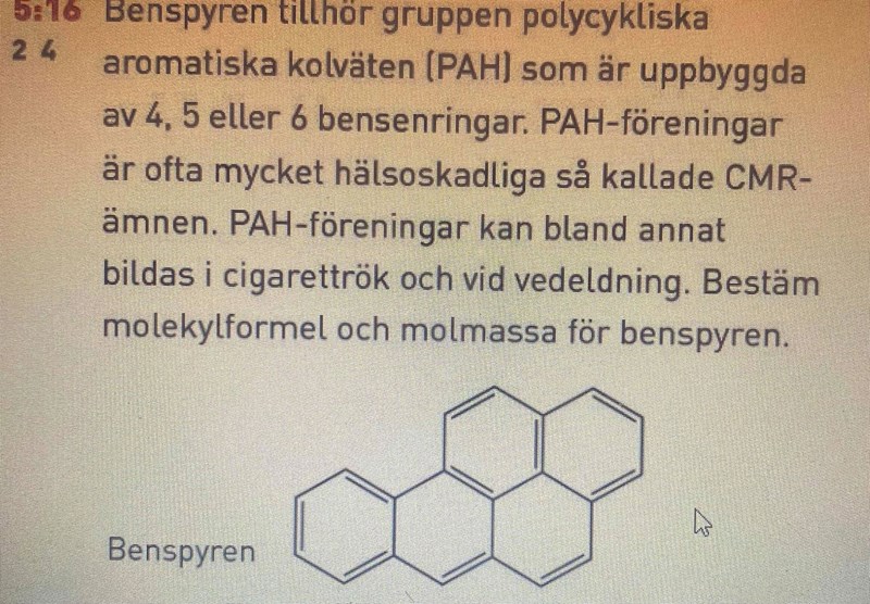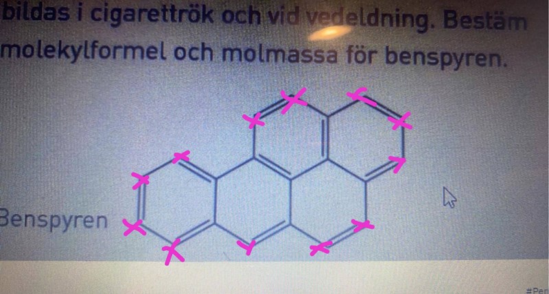 Du har helt rätt, 20 kolatomer. Många av dessa kolatomer binder redan med 4 bindningar (en dubbelbindning och två enkelbindningar på bilden, i verkligheten är det ungefär 1½-bindningar men det är lättare att hålla ordning på elektronerna så här). På de kolatomer som har tre bindningar (en enkel och en dubbel) finns det plats för en väteatom också. Hur många väteatomer blir det?