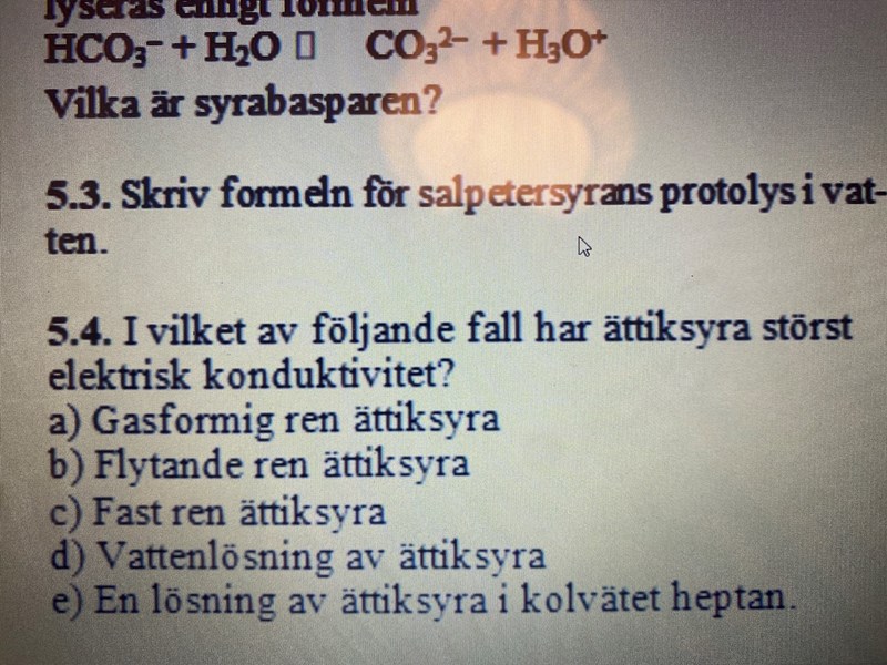 Ättiksyra är en molekyl, dvs i rent tillstånd leder det inte ström. Om det genomgår protolys bildas dock joner som kan leda elektricitet. I vilket av fallen sker en protolys?