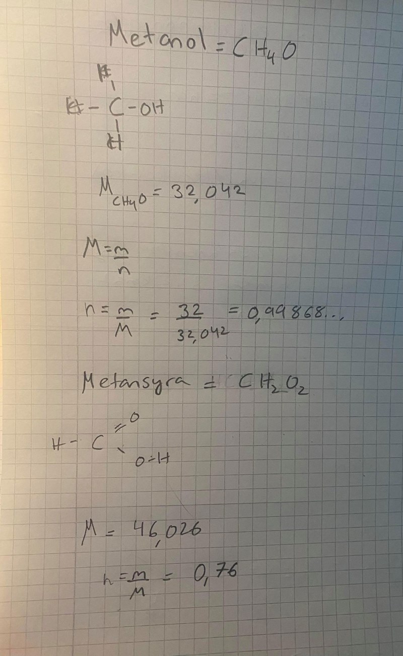 Hur många mol är 32 g metanol? Hur många mol är 35 g metansyra?