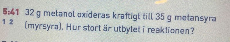 Man hade alltså (väldigt nära) 1 mol metanol från början. Om utbytet hade varit 100 % borde man ha fått fram 1 mol syra, d v s 46 g. Nu fick man bara 35 g, så utbytet är...