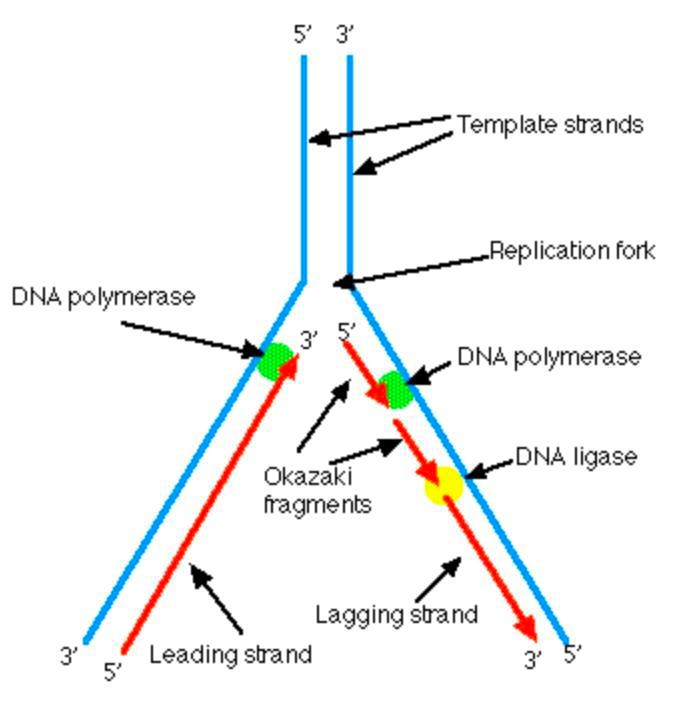 Och fram för allt kan DNA-polymeraset arbeta på både leading och lagging strand samtidigt under replikationen. De vätebindningar som finns mellan nukleotidbaseran är ganska lätta att bryta så att DNA-polymeras kommer åt att binda in och syntetisera en ny komplementär sträng av DNA (röda i bilden nedan).
