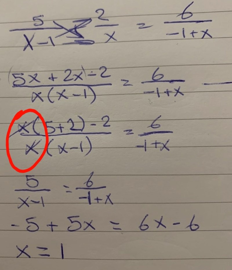 Det är sant, men grejen är att redan från första gången så kunde jag ta 5/x-1 över till andra sidan för båda har samma nämnare (x-1 = -1+x). Så man subtraherar 5/x-1 på båda sidor och sen löser man den enkelt då det blir att 2/x = 1/x-1.