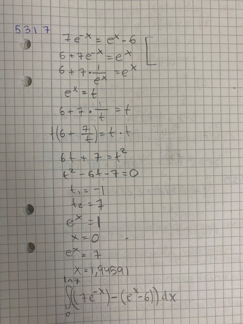 Prim: -7e^(-x)-e^x+6x +C (men den behövs ej för integralen)
