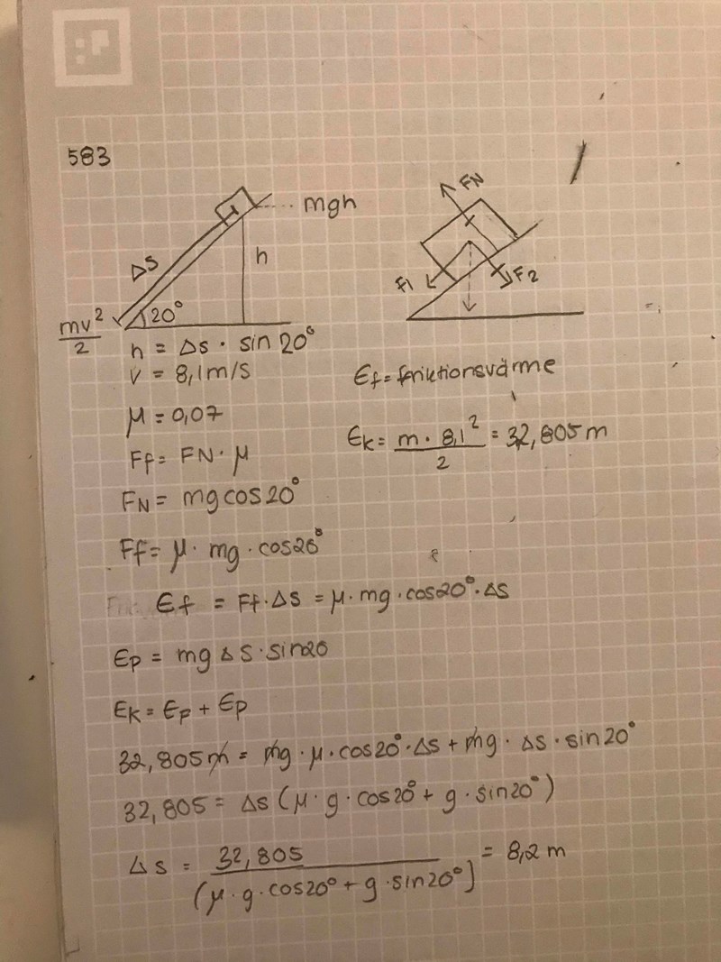 där W är arbetet, F är kraften som i detta fall blir friktionskraften och s (eller delta s) som är lägesändringen, i detta fall sträckan då. Både fysikaliskt arbete och energi mäts i enheten Joule (J). Så just i detta sammanhang så kan man därför använda formeln.