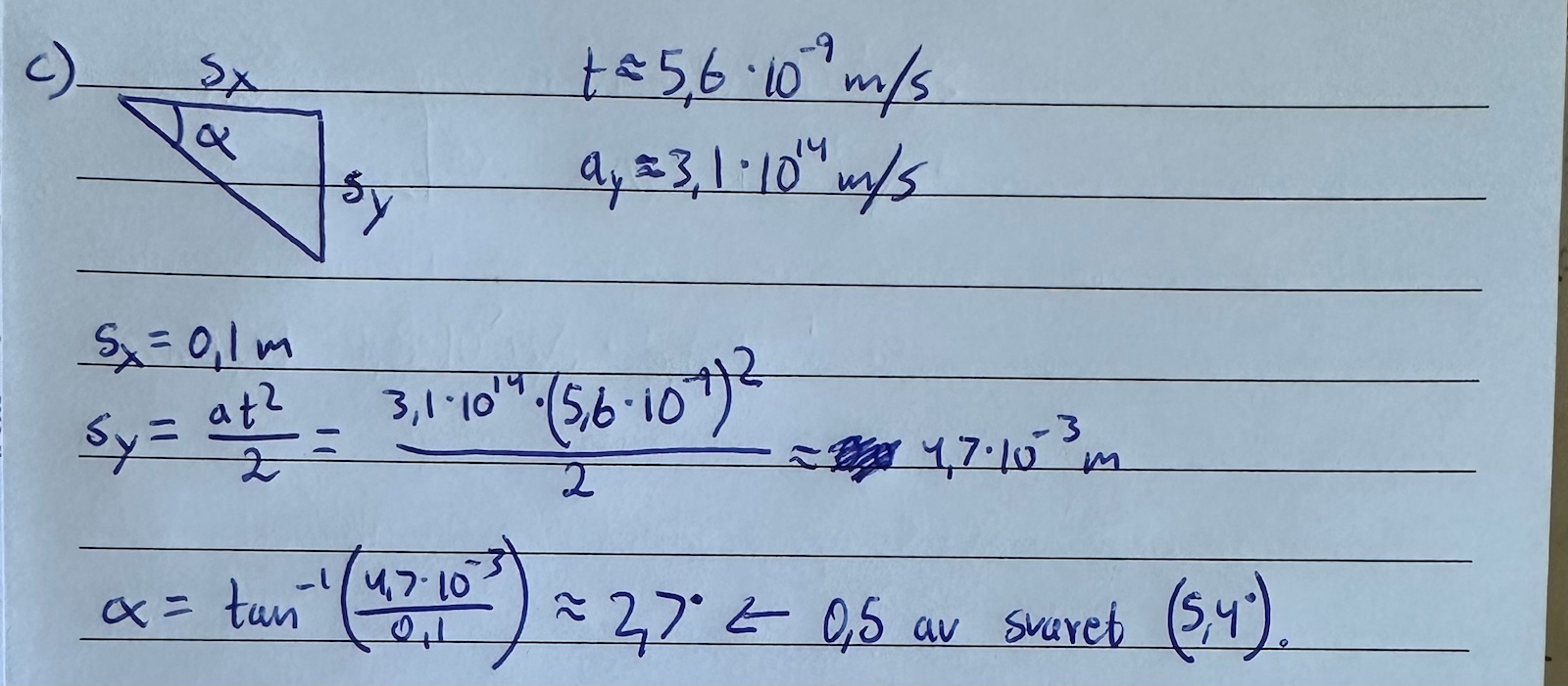 Hej, jag förstår inte vad jag har gjort fel på c-uppgiften här. Jag förstår vad facit menar med att man kan använda hastigheterna för att få ut vinkeln, jag har även testat att göra det själv med hastigheten och fick då rätt vinkel.