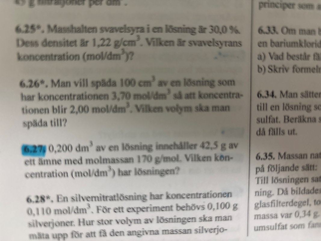 Och din uppgift är att räkna ut koncentrationen, men i mol/dm3 istället. Och då kan du inte bara multiplicera en massa med en koncentration angiven i massprocent, du behöver räkna om till mol/dm3.