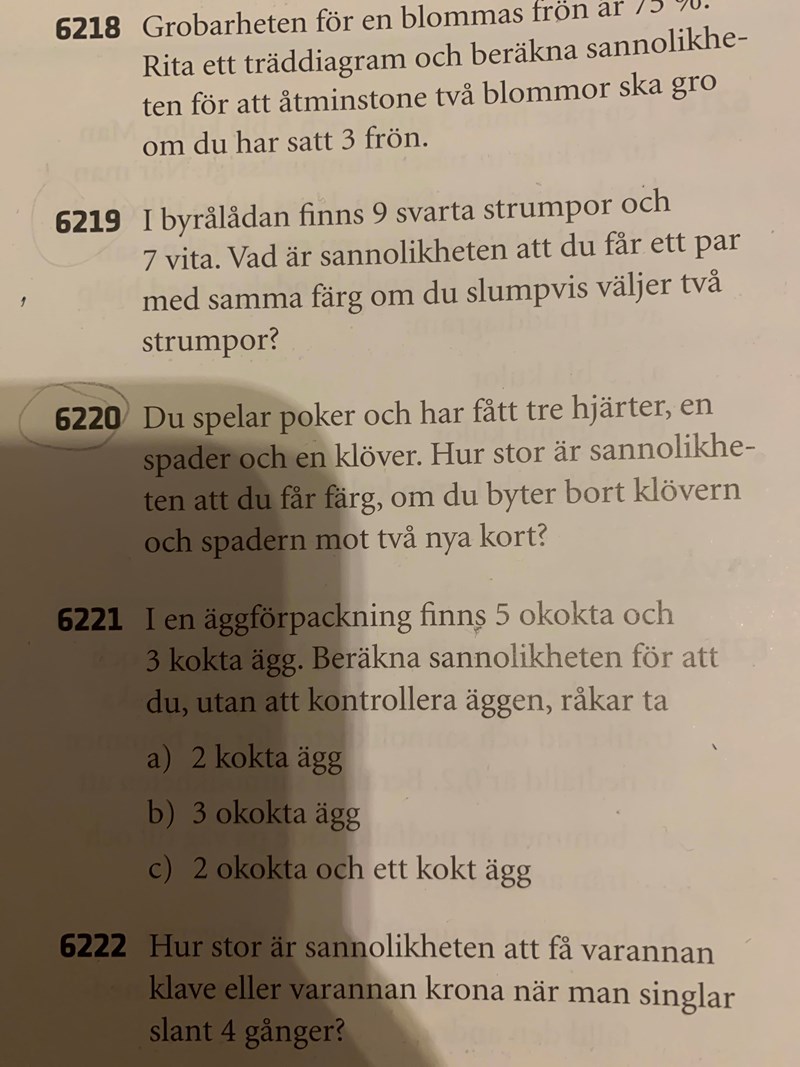 Jag är på uppgift 6220 och har fastnat. Ruter och hjärter är ju de med färg. Det finns 13 av ruter och 10 av hjärter då 3 av dem är i handen. Finns 47 kort sammanlagt då man har 5 i handen.