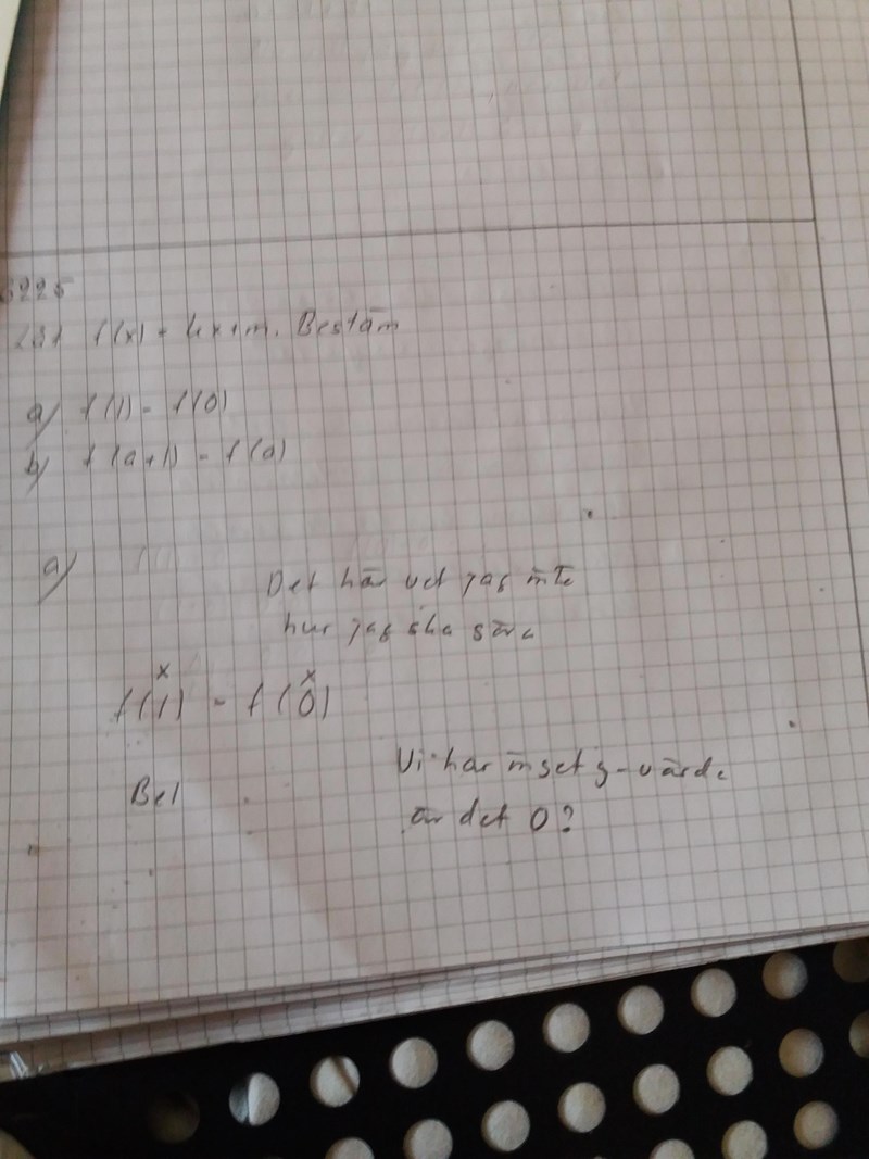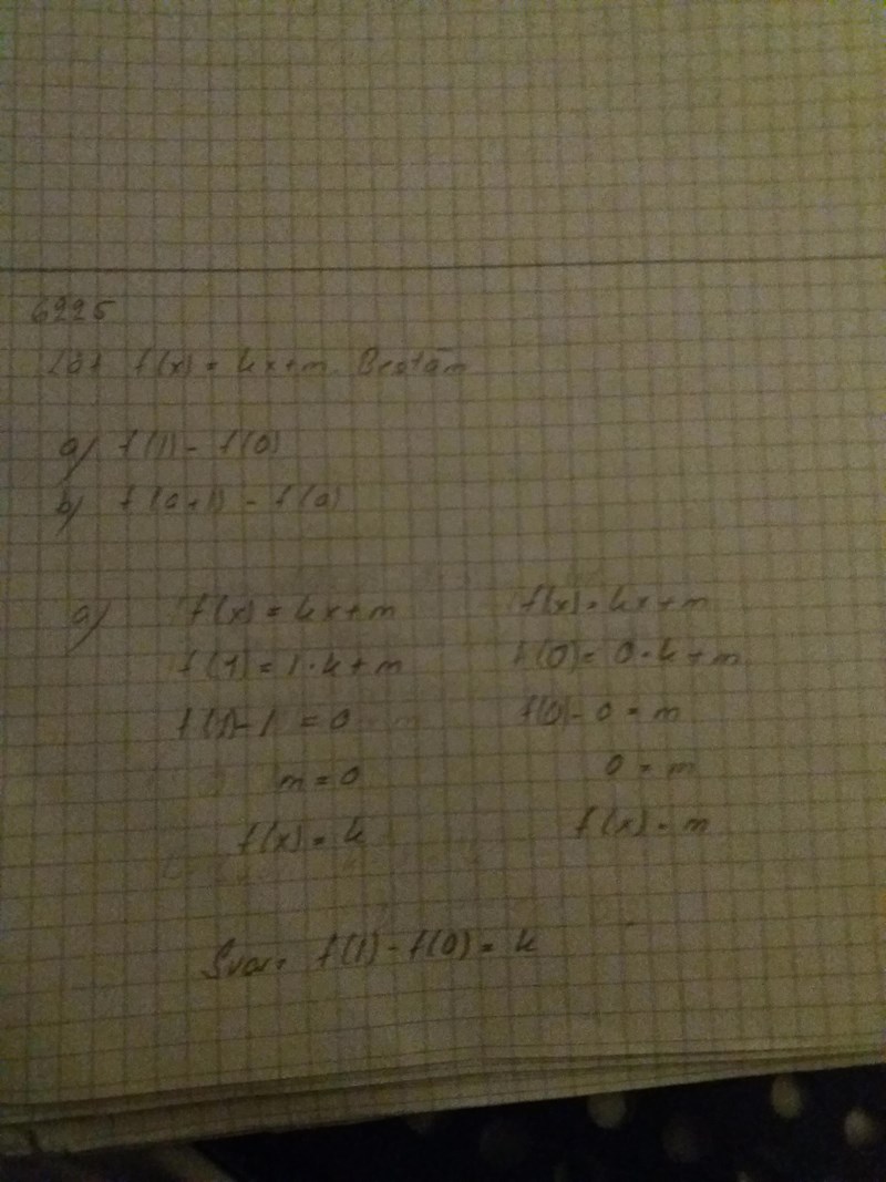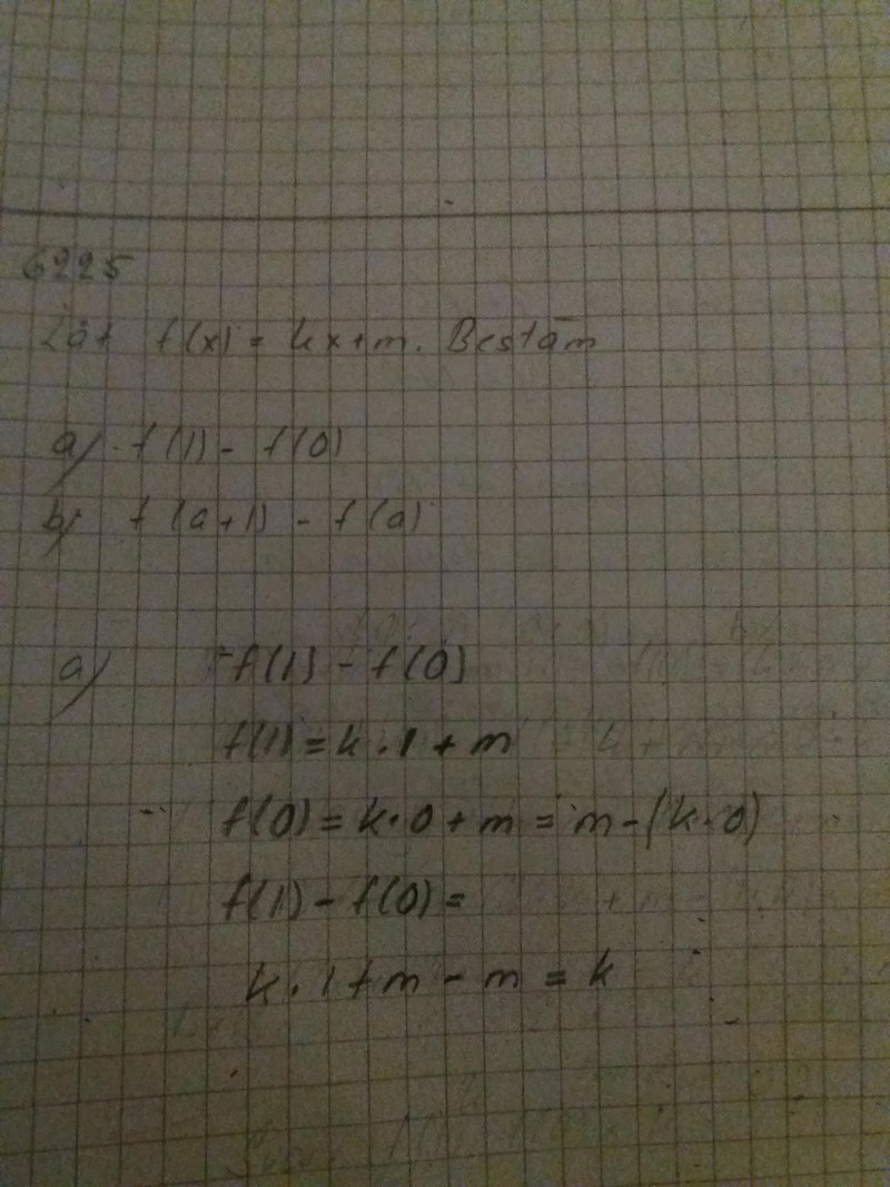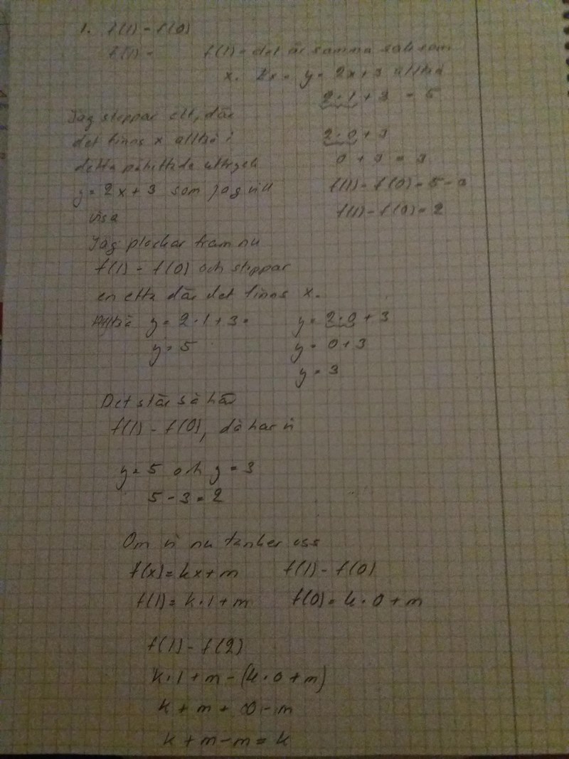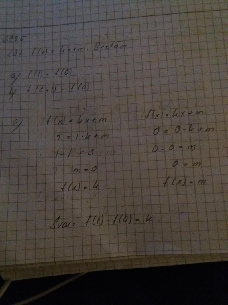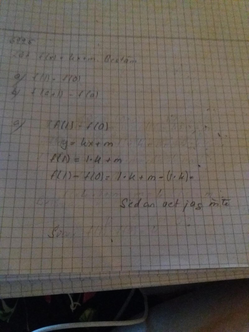 Det betyder att f(a + 1) - f(a) = k*a + k + m - (k*a + m) = k*a + k + m - k*a - m = k.Svar: f(a + 1) - f(a) = k.