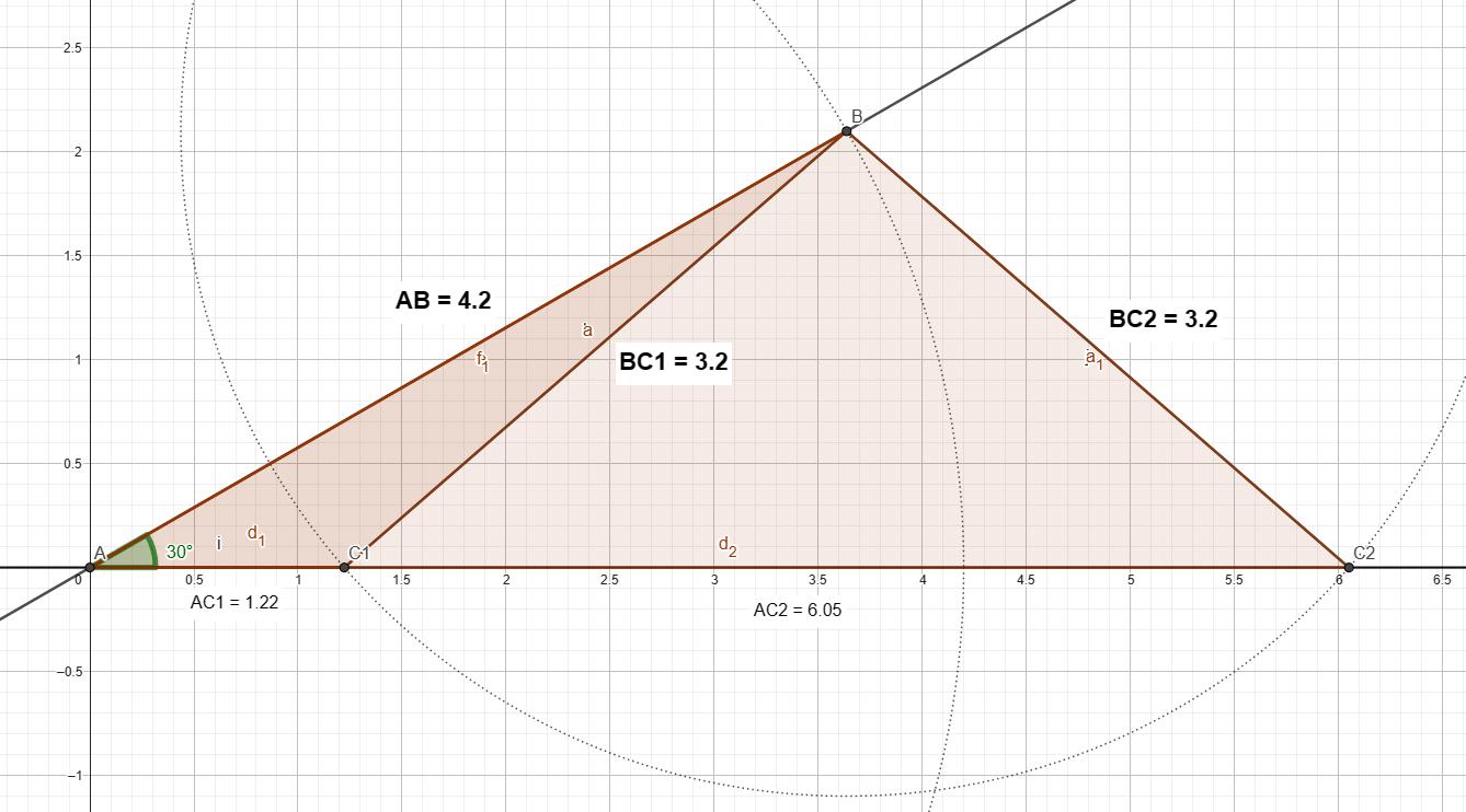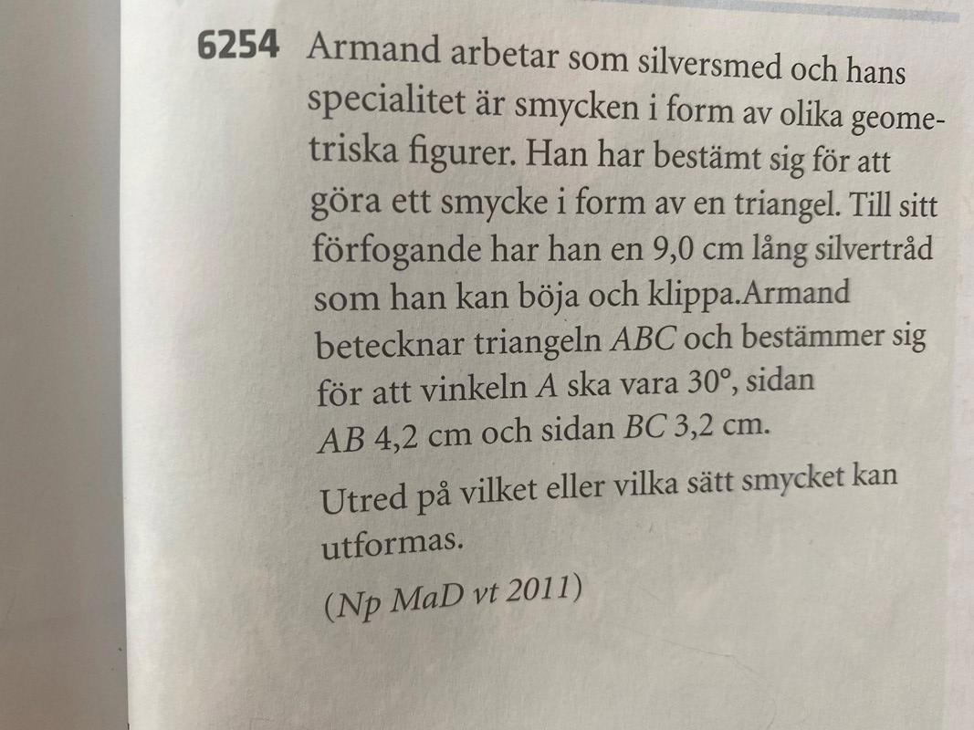Jag tror inte du behöver lägga så mycket tid på att räkna. I NP vill man nog se om du kan konstatera att det givet de tre förutsättningarna går att rita två olika trianglar och sedan välja bort en av dem.