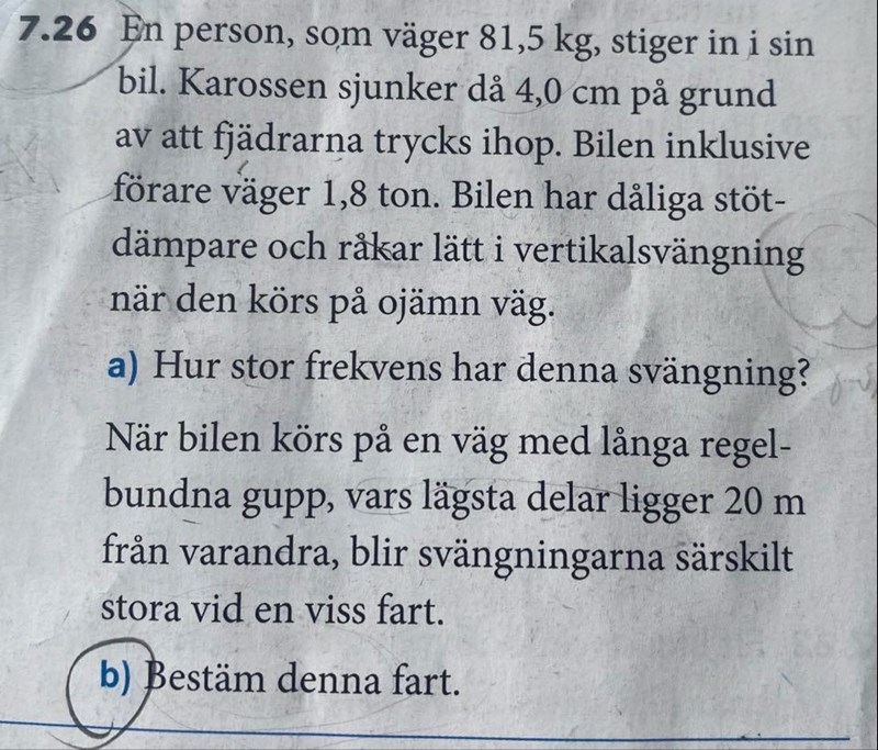 Om det då ska bli extra stora svängningar måste frekvensen som guppen kommer med vara lika stor som frekvensen hos bilen, som du räknade ut i a).