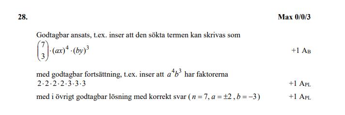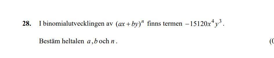 Jag skrev (n över 3) istället för (7 över 3), eftersom det fjärde elementet i Binomialsatsen kan man på fjärde termen alltså k=3 tolka en av variablerna som upphöjt till 3, sedan gick jag vidare där ifrån och satt det hela utrycket = grundutrycket fick för många okända variabler